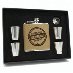 6 OZ בולט לוגו מותאם אישית על עור סט בקבוקון נירוסטה עם 4 יחידות Shot זכוכית ו2 משפך קטן